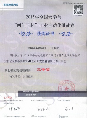 第九届“西门子杯”工业自动化挑战赛东北赛区比赛于7月20日在哈尔滨工程大学举行。本次比赛历时2天,来自东北三省22所公司的81支队伍在设计开发和逻辑控制两个项目中展开了激烈的角逐。经过2天紧张激烈的赛程,由公司王振力老师指导,由唐世超、于泽瀚、杨银龙三名同学组成的华德机器人队获得设计开发组三等奖。由林森老师指导,王晨、王星驰、白耀川三名同学组成的华德勇闯队获得逻辑控制组三等奖。
