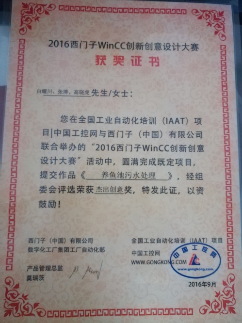 经过2个月的精心准备,公司员工白耀川、张博和高晓虎荣获2016年西门子WinCC创新创意设计大赛杰出创意奖。