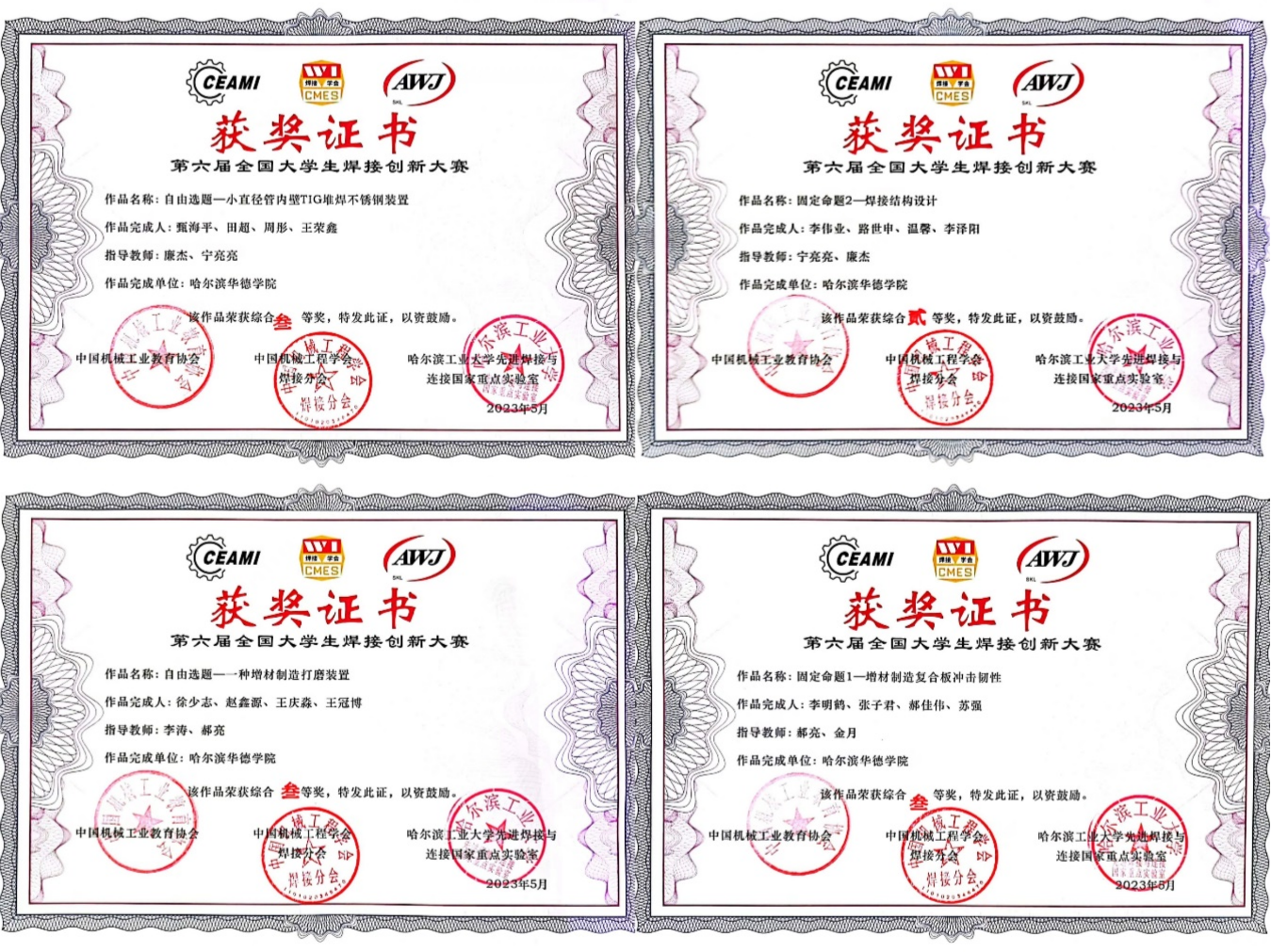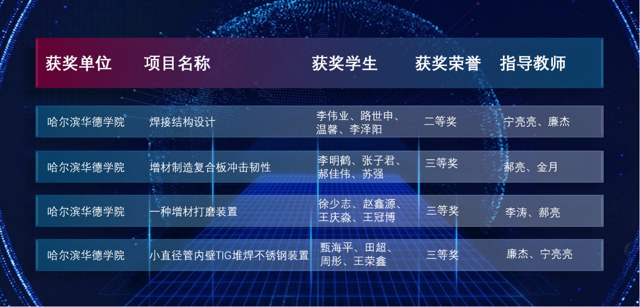 本次大赛在全国共有来自哈尔滨工业大学、天津大学、清华大学等62所高校的187组作品报名参赛,其中118件固定命题作品和69件自由选题作品,经过作品现场测试、答辩、专家提问等环节展开激烈比赛。经过激烈角逐公司焊接技术与工程专业派出的四支参赛队伍全部获奖,取得了二等奖1项、三等奖3项的优异成绩。