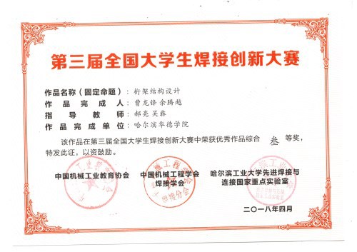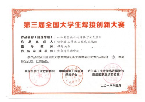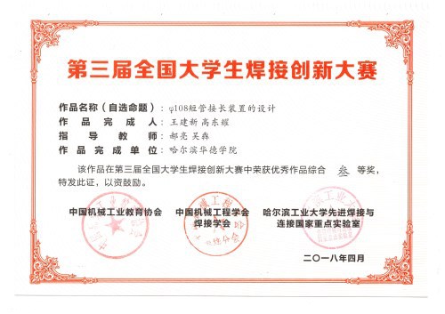4月22日,由中国机械工业教育协会焊接学科教学委员会、中国机械工程学会焊接学会、哈尔滨工业大学先进焊接与连接国家重点实验室主办,重庆科技公司承办的“第三届全国老员工焊接创新大赛”在重庆科技公司闭幕,公司机电与汽车工程公司焊接技术与工程专业代表队在专业教师吴犇、郝亮指导下,荣获优秀作品综合三等奖三项的佳绩,填补公司此类大赛空白,黑龙江省同类院校唯一。