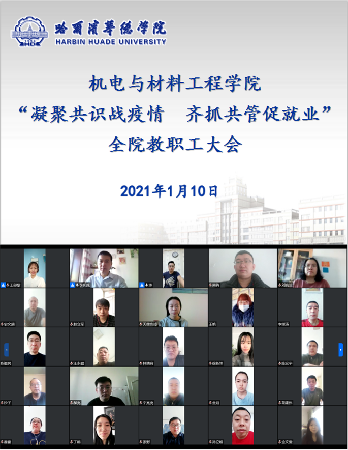 1月10日,机电与材料工程公司通过腾讯会议平台召开“凝聚共识战疫情,齐抓共管促就业”全院教职工大会。董事长助理兼机电与材料工程公司经理李长威、公司党总支书记王郁黎、副经理吴犇及全体教职工出席会议,会议由团总支书记杨志承主持。