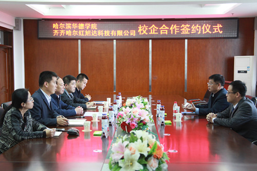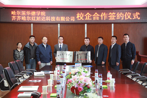 签约仪式上,曲伟建副董事长代表公司对企业来校合作表示热烈欢迎,并就公司人才培养目标、学科专业建设情况等方面做了介绍。齐齐哈尔红旭达科技有限公司总经理邵志在对公司人才培养以及公司未来发展做简要介绍后表示,华德公司是一所治学严谨、办学特色鲜明的公司,华德学子在社会上也广受好评,他相信本次校企合作能够为公司进一步开阔就业、科研等渠道,同时也能为自身企业创造更多价值,最终实现双赢。