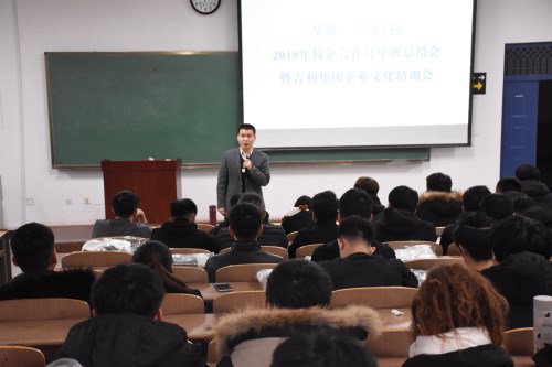 会上,李长威经理讲到,吉利集团现在代表的是中国民族汽车品牌,吉利集团未来的发展前景需要各位的努力去实现,希望同学们都能够在企业中得到锻炼,并且能够坚持到实习最后,讲话中,李经理强调希望同学们在实习期间能够严于律己,树立华德学子良好形象,打造校企合作良好品牌,为就业奠定基础。在今后的实习和学习期间,公司与企业会联合培养员工,希望同学们能够珍惜机会,多加锻炼,在公司和企业搭建的平台上大展鸿图。付洪涛书记讲到,全体订单班成员一定要牢记自己是华德人的身份,在企业的实习工作中形成华德效应,希望各位学员能抓住学习机会,摆正学习心态,正确认识自我,认真刻苦学习知识和技能,磨炼意志品质,在企业中向你们的学长看齐,勇于超越。随后吴艳秀老师就吉利集团企业文化对2018年华德--吉利公司校企合作订单班全体成员进行了培训。