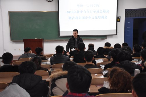 12月24日,公司华德-吉利公司在教五202教室组织开展了华德—吉利公司2018年校企合作订单班总结会暨吉利集团企业文化培训会。董事长助理、机电与汽车工程公司经理、华德--吉利公司经理李长威、机电与汽车工程公司党总支书记、华德--吉利公司副经理付洪涛、机电公司车辆工程系主任、华德--吉利公司指导教师吴艳秀、华德--吉利公司辅导员赵强出席,全体2018年华德--吉利公司校企合作订单班全体成员参加此次会议。