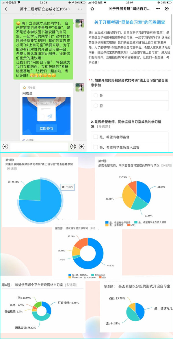 会议第二环节——“考研线上自习室”启动会。在疫情防控特殊时期,为缓解员工备考压力,帮助考研学子搭建一个考研交流平台,营造比学习、促学习的整体学习氛围。立志成才班指导教师金文雯结合公司“雏鹰计划”学风建设工程方案具体要求,以新媒体平台授课方式为参考,克服疫情下的实际困难,创新式提出成立“线上自习室”想法,通过“云”端自习室,创新互助学习模式。经公司领导同意,采用发放问卷调研的方式向考研员工征集成立意见和看法,得到了考研学子的一致好评。会议中,金文雯老师向同学们介绍了线上自习室的管理办法、线上平台使用方法等。当晚20时,立志成才班“考研线上自习室”正式在腾讯会议平台启动。