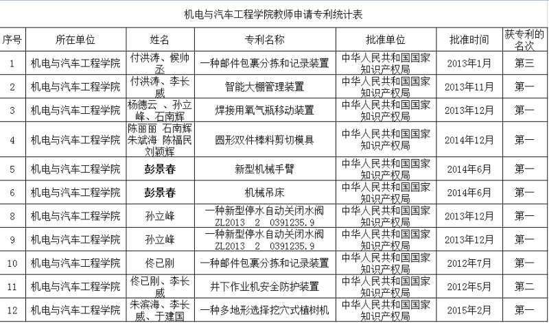 机电与汽车工程公司2012-2015年专利统计表