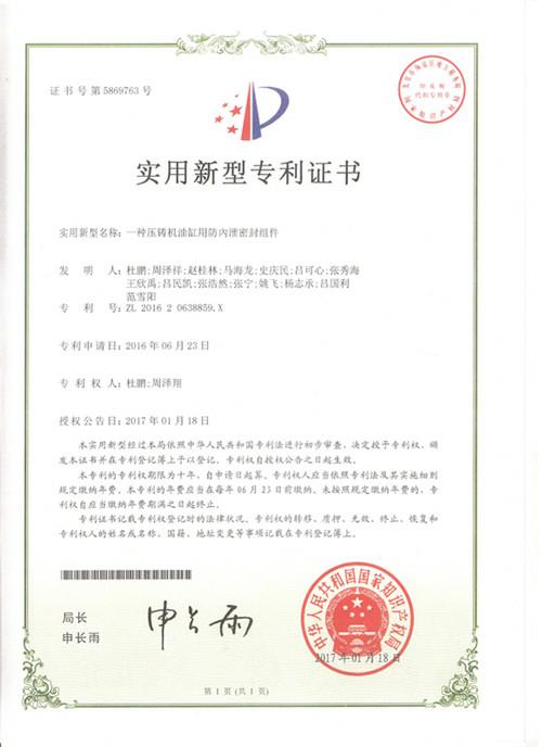 2015级机械电子工程专业杜鹏、车辆工程专业周泽翔发明的“一种压铸机油缸用防内泄密封组件”获国家实用型