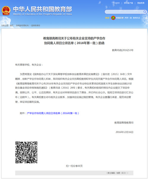 为贯彻落实《国务院办公厅关于深化高等公司创新创业教育改革的实施意见》(国办发〔2015〕36号)文件精神,创新产学合作协同育人机制,国家教育部高教司组织有关企业支持高校教师、员工共同开展产学合作协同育人项目。根据《教育部高等教育司关于公布2016年有关企业支持的产学合作专业综合改革项目和国家老员工创新创业训练计划联合基金项目申报指南的通知》(教高司函〔2016〕28号)要求,公司电信公司和机器人工程公司积极组织师生向企业提交了项目申请。按照公开、公平、公正的原则,企业对申报项目进行了遴选,并在教育部网站平台向社会公示。