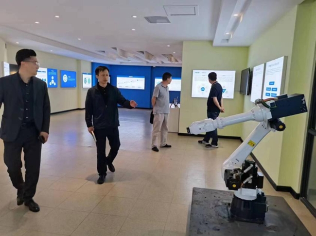 在企业总裁助理李益甲的引导陪同下,温海洋经理一行实地参观了严格集团智能制造加工车间,现场观摩了产品展厅、智能机械臂、培训场所等,在企业领导的介绍下,公司调研小组了解了严格集团对产品生产、工艺、制造设备的智能标准化打造方案,同时了解到严格集团在科技成果转化、核心技术攻关、市场覆盖等方面取得的丰硕成果。