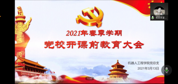 3月13日,机器人工程公司党总支通过腾讯会议平台组织召开了2021年春季学期党校开课前教育大会,2021年春季学期入党积极分子培训班学员参加大会,大会由党总支宣传委员王泽鹏主持。
