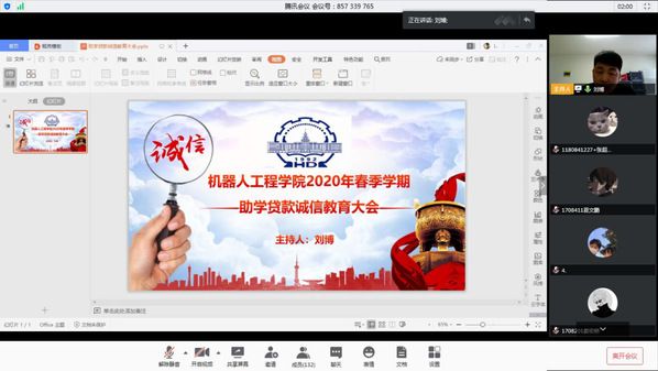 为深入宣传国家资助政策,增强员工诚信意识和感恩意识,切实发挥高校员工资助工作的育人作用,机器人工程公司于5月19日通过“腾讯会议”召开机器人工程公司2020年春季学期助学贷款诚信教育会议。机器人工程公司副经理刘张、团总支书记刘存艳、全体辅导员及办理2020年度黑龙江省国家助学贷款(续贷)员工参加会议,会议由辅导员刘博主持。
