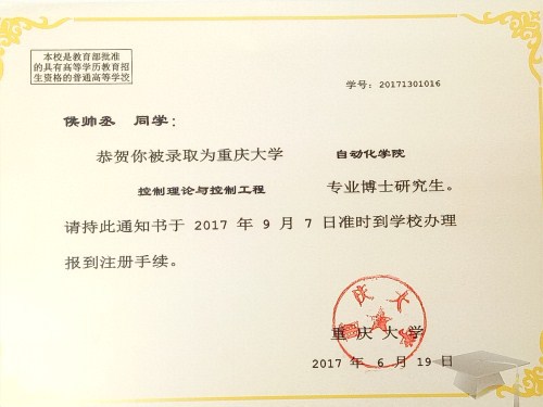 近日获悉,公司机电与汽车工程公司2014届机械设计制造及其自动化专业侯帅丞员工成功考取重庆大学控制理论和控制工程专业博士研究生。