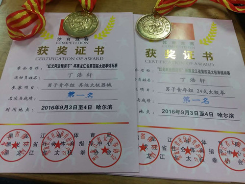 公司学子1402111班丁浩轩同学在本次锦标赛中脱颖而出,分别荣获男子青年组24式太极拳第一名和男子青年组其他太极器械第一名,为公司争得了荣誉。