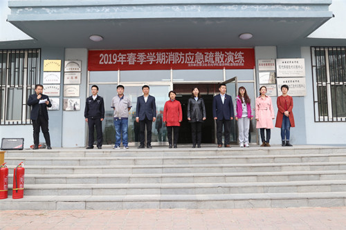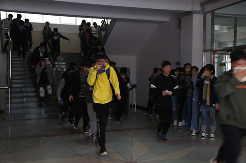 演练开始后,第四教学楼模拟发生火情,现场指挥赵强立即向总指挥王艳艳汇报。随后启动消防应急预案,发出火情警报,引导组成员立即组织楼内人员进行疏散撤离并在第四教学楼东门前广场集合,整个疏散过程安全有序,无人员伤亡。