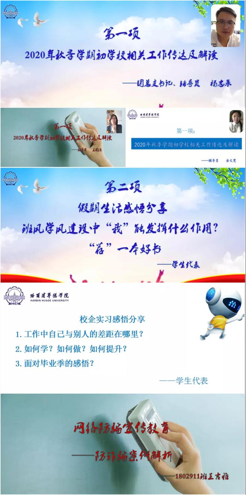 为全面做好疫情后返校工作,提升机电公司同学返校途中的安全意识,传达新学期公司整体工作要求,引导全体同学以良好的精神面貌迎接新学期工作、学习、生活,机电公司于8月20日—23日组织各班级通过“云端”会议的方式开展“常态化开展疫情防控,以崭新的姿态迎接新学期”网络主题班会,德育导师、责任班导师、辅导员及公司全体员工参加。