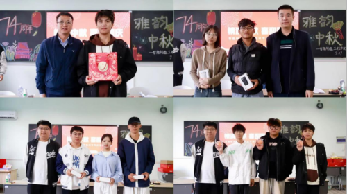 除了游戏环节外,本次茶话会还设置了抽奖这一惊喜环节,同学们入场时随意选择自己的号码,由参会的三位老师和同学们分别抽取了一、二、三等奖和幸运奖共10个幸运儿,并由与会的领导老师进行了颁奖和合影留念。