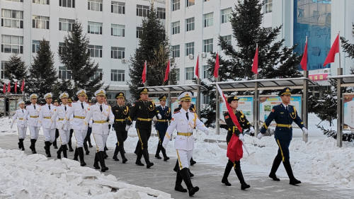 迎着朝阳,国旗护卫队队员们将鲜艳的五星红旗护送进场,伴随着庄严的《义勇军进行曲》,全体师生满怀壮志,肃立在升旗仪式现场,向国旗行注目礼,共同见证五