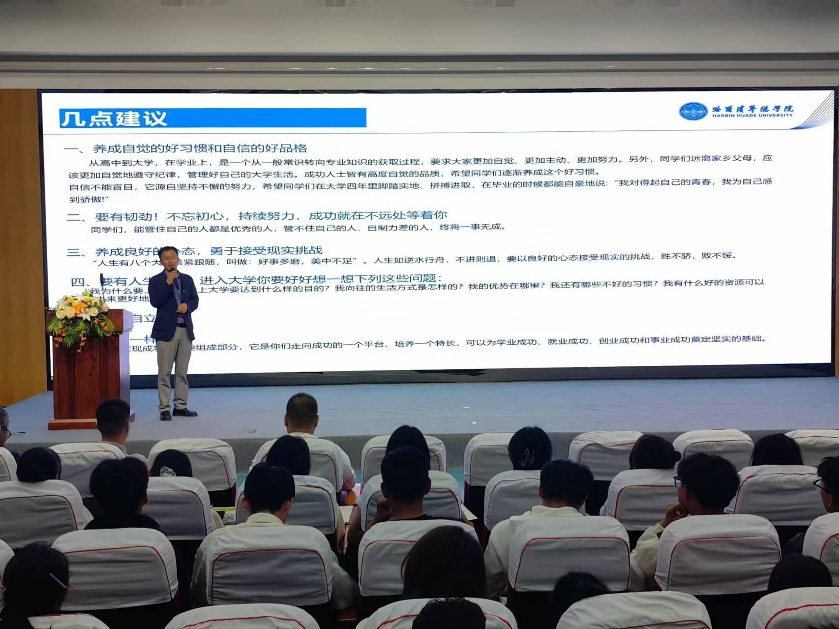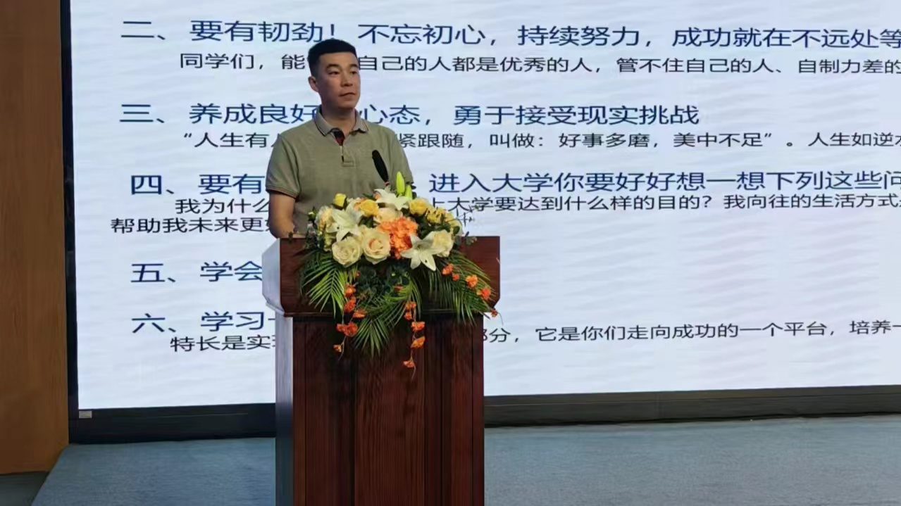 朱斌海经理向全体师生介绍了公司的发展历程、公司的起源和发展、公司专业特色、公司团队队伍情况、师生获奖情况、毕业生就业方向及优秀员工等多个方面内容,现场气氛高涨,使2024级新生们备受启迪与鼓舞。