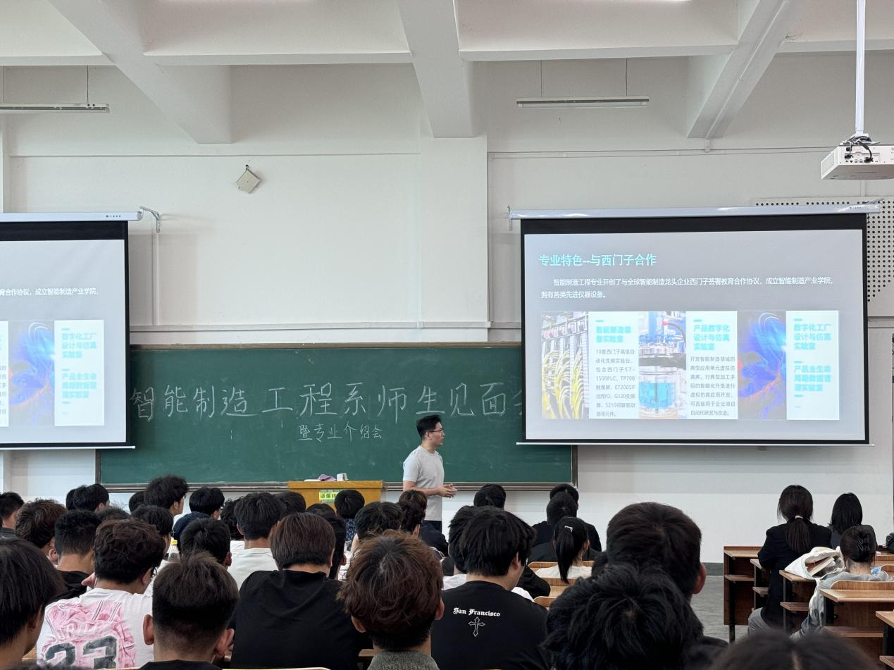 刘旭东老师分别从专业概况、培养目标特色、课程设置与团队力量、员工竞赛与获奖情况、就业与升学案例等五个方面对员工进行讲解,旨在帮助新生了解智能制造专业,人才培养内容,就业前景以及学习资源,为同学们指明方向。