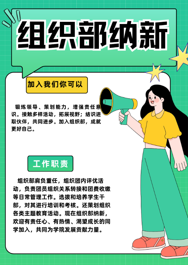 组织部是一个严谨的部门,同时也是公司团总支的核心部门,主要协助团总支加强全院共青团思想建设、组织建设以及共青团干部培养和管理的重要职能部门。在这里我们会举办与团相关的系列活动,在活动过程中我们个人的组织、策划、主持、沟通等能力都可以得到很好的锻炼。