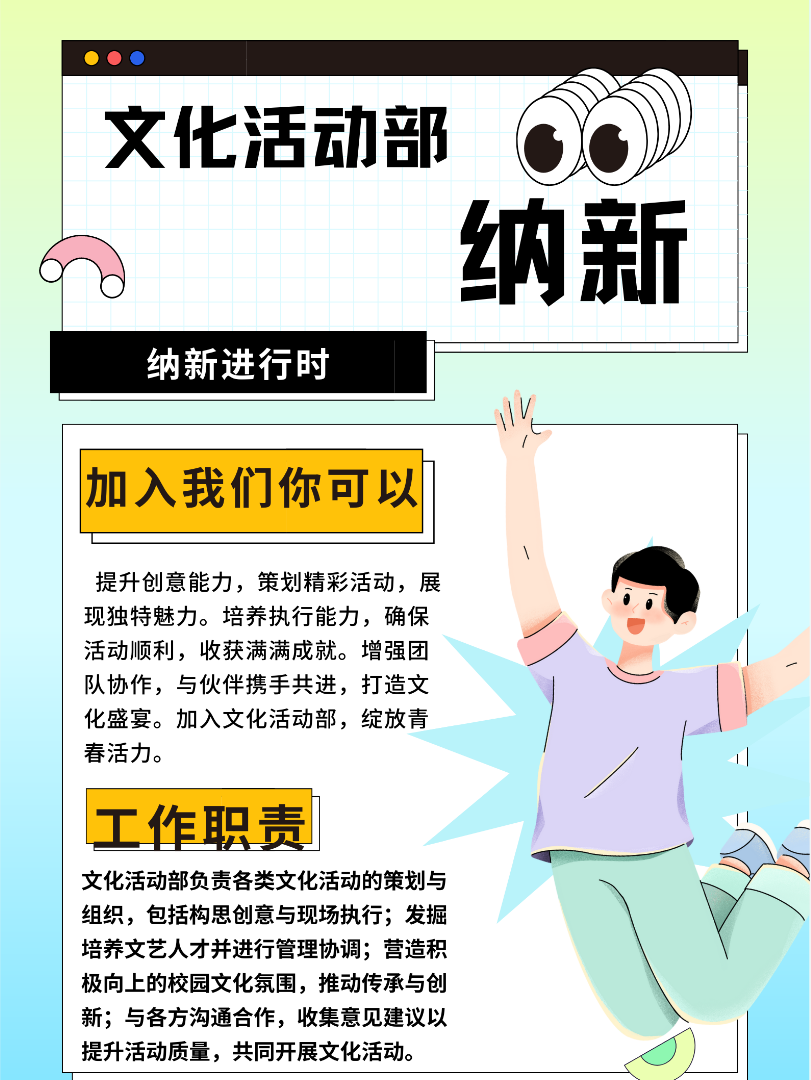 文化活动部,是公司内一处充满艺术氛围与创意活力的天地。专注于策划和组织各类文艺活动,如校园文化艺术节、团体操、运动会等,旨在为每一位热爱文艺的同学提供展示自我和相互交流的平台。在这里,你可以尽情释放你的艺术热情,探索无限可能,同时也有机会与一群志同道合的朋友共同成长。加入文化活动部,不仅能够提升你的艺术素养,还能让你的老员工活更加丰富多彩。期待你的加入,让我们携手共创文艺部的辉煌未来!