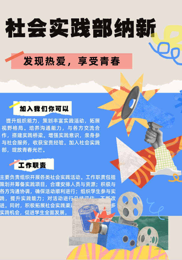 社会实践部是走出校园、拥抱社会的舞台,能参与丰富实践活动,拓展视野、增长见识。走进社区传递关爱,组织公益活动贡献力量,提升组织和沟通能力。雷锋精神践行团传承弘扬雷锋精神,与志同道合伙伴践行奉献、友爱、互助、进步志愿精神,参与志愿服务,宣传雷锋精神。二者结合,碰撞无限可能与精彩,既锻炼自己又收获心灵满足。渴望成长、热心公益、想为老员工活添彩的你,别犹豫,加入我们,在社会实践中践行雷锋精神,绽放青春光彩!