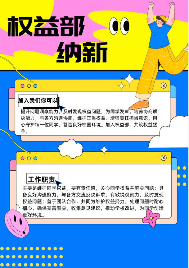 权益部,是一个充满活力与温暖的组织。我们倾听同学们的心声,致力于解决大家在学习和生活中的问题,只要是与同学们权益相关的事情,都是我们关注的焦点。在这里,你将有机会参与到各种权益维护的工作中,锻炼沟通协调、问题解决和团队合作能力。我们会组织部门团建、食堂调研等多种活动,让你在实践中不断成长。