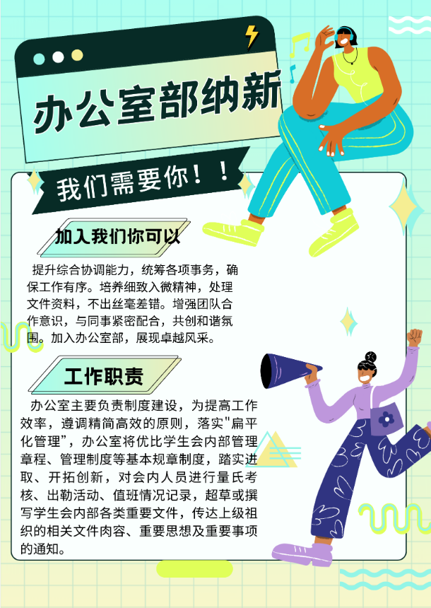 “用创意勾勒青春画卷,以宣传奏响青春乐章。”这里是灵感的汇聚地,文字与画面交织,传递校园的温度。我们用海报展现风采,用推文记录精彩。加入宣传部,你将成为校园故事的讲述者,活动亮点的聚焦者。在这里,提升技能,结交挚友,绽放属于你的光芒。2024,宣传部与你一同书写智能学子的璀璨篇章。”