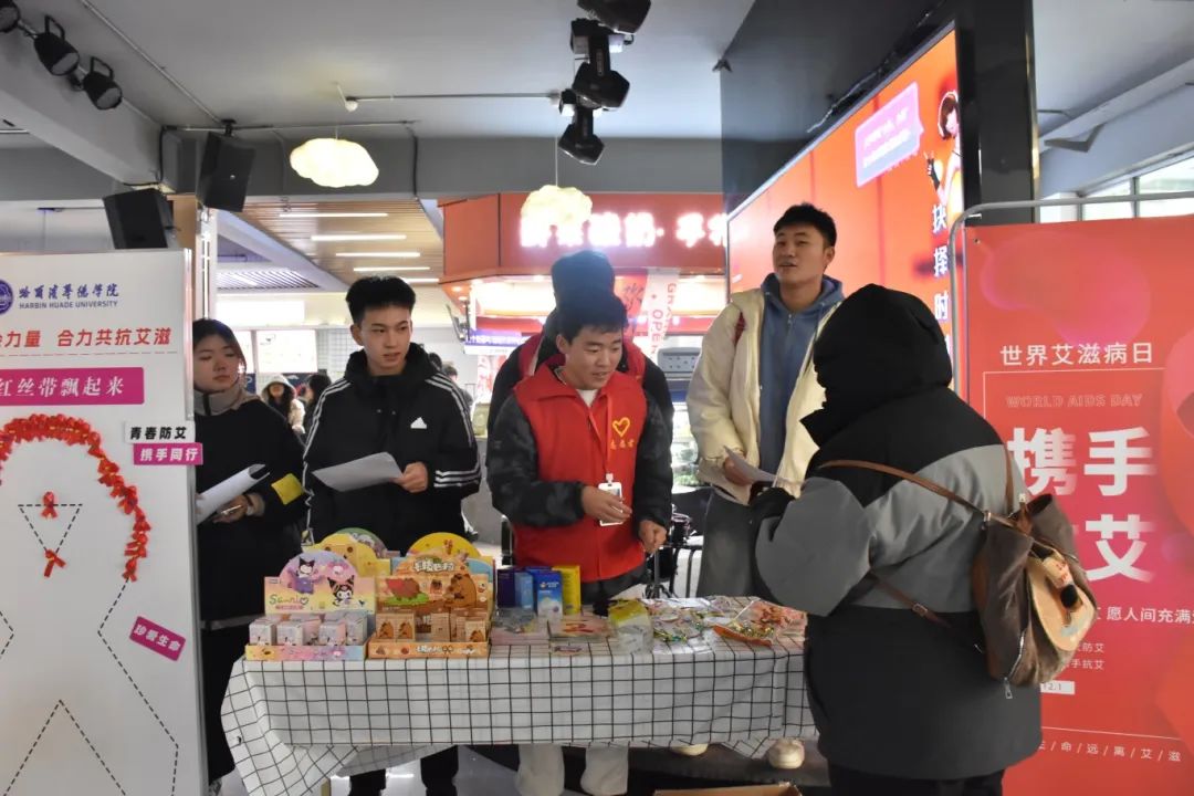 瞧一瞧!看一看!11月29日中午防艾小商铺在食堂一楼正式营业,“华小德”化身最萌防艾推销官,吸引众多同学驻足打卡。雷锋精神践行团和爱心社团志愿者们轮番上阵,“防艾知多少”、“艾滋病传播途径”、“防艾知识快问快答”、“防艾问卷填写收集”等众多互动将防艾热情推到高潮。