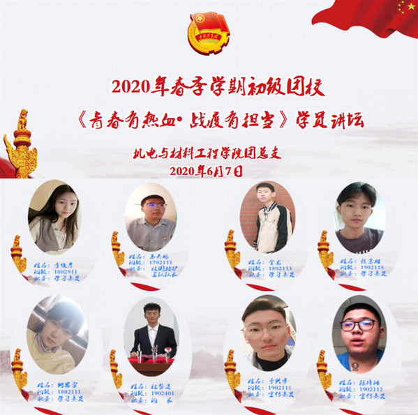 6月7日,机电公司团总支通过团课“云”发声的形式开展2020年春季学期初级团校《青春有热血•战疫有担当》学员讲坛,公司党总支书记王郁黎、团总支书记杨志承、全体辅导员及初级团校全体学员参加培训,会议由初级团校负责人1802111班王传胤主持。