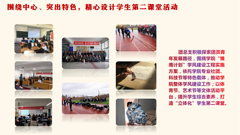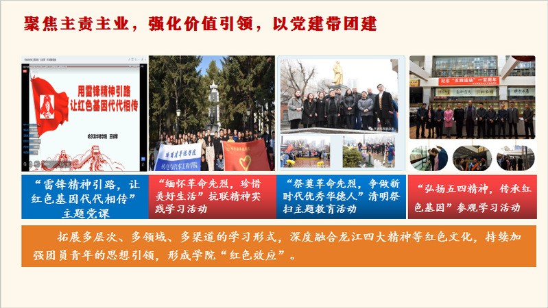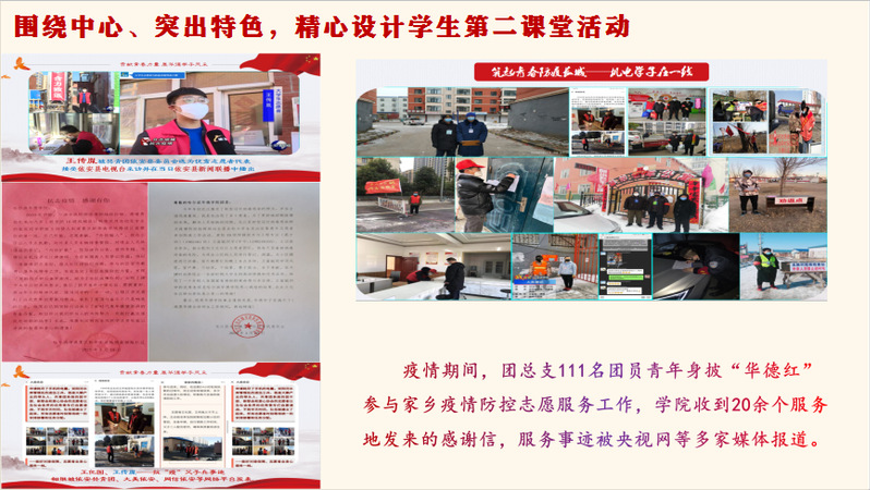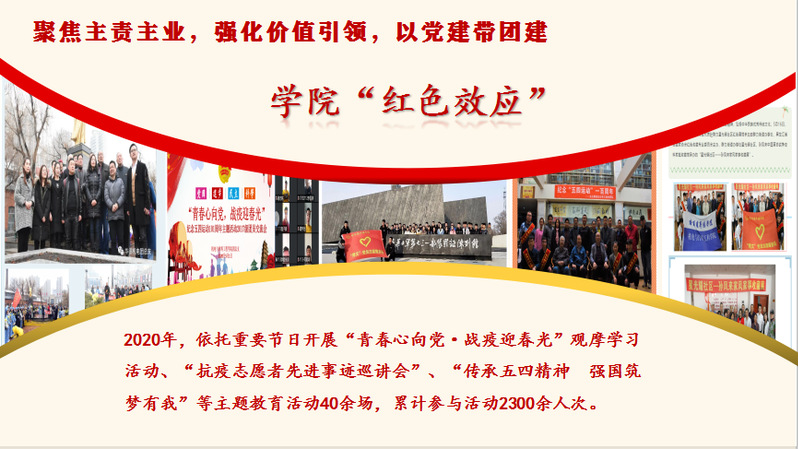 多年来,团总支始终坚持“思想建团、作风树团、人才强团”的工作思路和“党建带团建、团建促党建”工作模式,将团员青年的思想建设放在首位,强化思想价值引领,做实党总支-团总支-团支部三级理论学习,切实发挥全员、全过程、全方位思想政治工作实效。依托青年大学习、学习强国等平台,拓展多层次、多领域、多渠道的学习形式。以党团课、“博文”党员志愿服务队等特色学习载体,深度融合龙江四大精神等红色文化,持续加强团员青年的思想引领,形成公司“红色效应”。2020年,依托重要节日开展“聆听榜样事迹,树立报国之志”新时代先锋宣讲团宣讲会、“青春心向党·战疫迎春光”观摩学习活动、“四进四信”、“一学一做”、“我的中国梦、华德梦、青春梦”等系列主题教育实践活动40余场。开展“奋斗的青春最美丽”抗疫志愿者先进事迹巡讲会3场,累计2300余位师生参加活动。