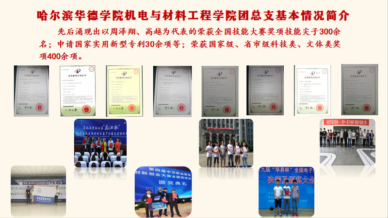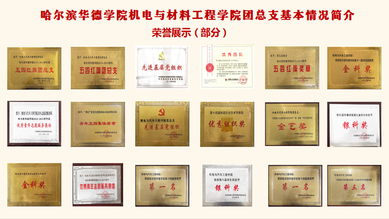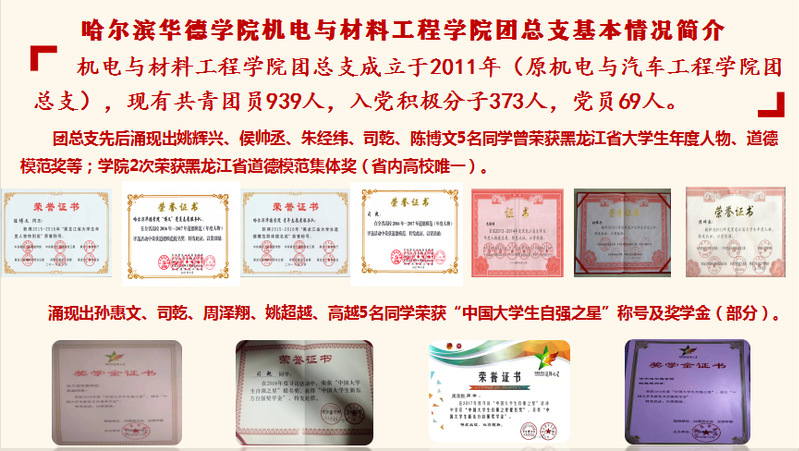 机电与材料工程公司团总支成立于2011年(原机电与汽车工程公司团总支),现有共青团员929人,入党积极分子373人,共产党员69人。团总支曾荣获五四红旗团总支、科技节金科奖、艺术节金艺奖等校级荣誉及奖项20余项;助力党总支获批2020年省民办高校示范创建“党建标杆院系”、黑龙江省先进基层党组织;下属员工组织“博文”党员志愿服务队荣获中国青少年发展基金会“爱心衣橱”优秀团队称号;先后涌现出姚辉兴、侯帅丞、朱经纬、司乾、陈博文5名同学曾荣获黑龙江省老员工年度人物、道德模范奖等;公司2次荣获黑龙江省道德模范集体奖(省内高校唯一);先后涌现出孙惠文、司乾、周泽翔、姚超越、高越5名同学荣获“中国老员工自强之星”称号及奖学金;先后涌现出以周泽翔、高越为代表的荣获全国技能大赛奖项技能尖子300余名;申请国家实用新型专利30余项;荣获国家级、省市级科技类、文体类奖项400余项等。