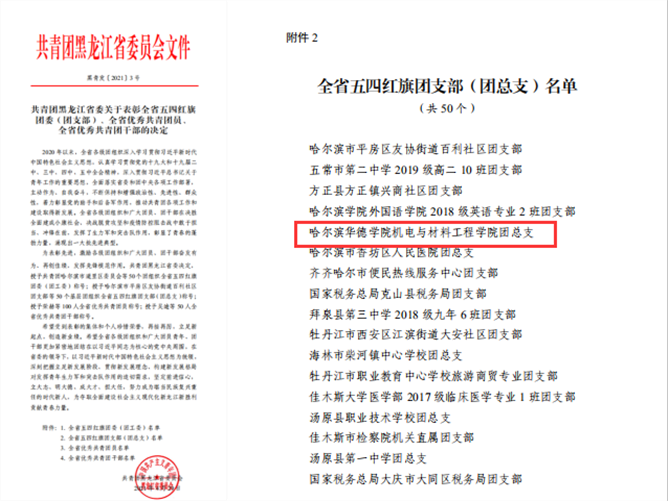 近日,共青团黑龙江省委员会印发《共青团黑龙江省委关于表彰全省五四红旗团委(团支部)、全省优秀共青团员、全省优秀共青团干部的决定(黑青发〔2021〕3 号)》。其中,公司机电与材料工程公司团总支荣获“全省五四红旗团支部(团总支)” 荣誉称号。