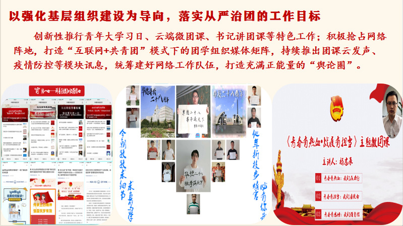 团总支坚持以强化基层组织建设为导向,规范公司团员队伍发展、教育、管理工作,落实“三会两制一课”制度,深入推进“青马工程”。创新性推行青年大学习日、云端微团课、书记讲团课等特色工作;积极抢占网络阵地,打造“互联网+共青团”模式下的团学组织媒体矩阵,持续推出团课云发声、疫情防控等模块讯息,统筹建好网络工作队伍,打造充满正能量的“舆论圈”。青年大学习参与率100%,开展特色活动40余场,累计参与4000余人次。团员100%录入智慧团建系统,3个团支部获“三好班级标兵”(全校9个),100余名团员青年荣获三好员工、优秀员工干部等奖项。