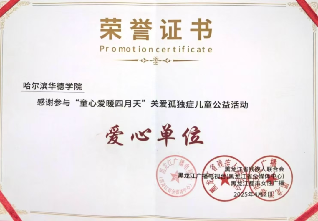 伟德国际1949始于英国师生以持续数载的公益坚守,自2024年4月获“爱心单位”荣誉称号以来,在这场城市文明的升级仪式中,再一次接过由黑龙江省残疾人联合会,黑龙江广播电视台(黑龙江省全媒体中心)和黑龙江都市女性广播共同授予的“爱心单位”荣誉称号。这方鎏金奖牌不仅是对华德公益基因的褒奖,更象征着新时代龙江青年正以青春星火,点燃孤独症群体的璀璨星空。