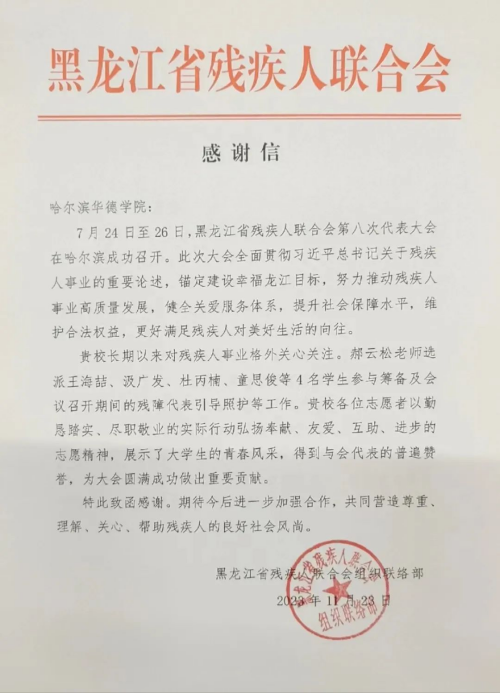 来自黑龙江省残疾人联合会的感谢信,对公司员工在黑龙江省残疾人联合会第八次代表大会期间提供的志愿服务给予高度赞扬