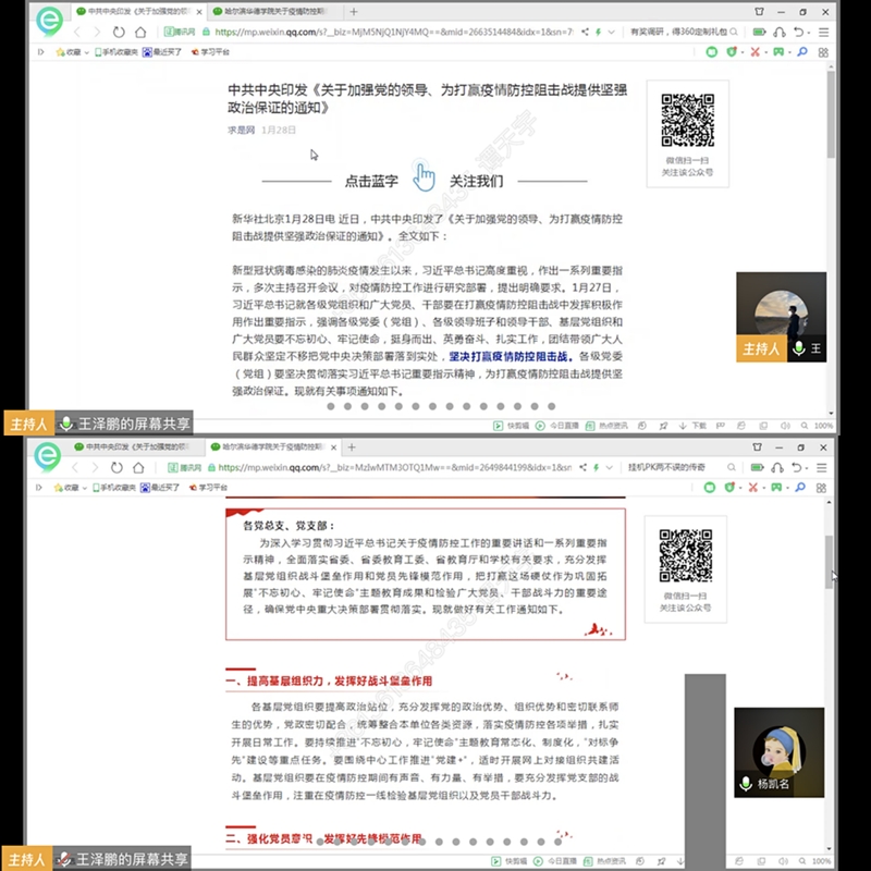 会上,支部组织委员杨凯名和宣传委员王泽鹏分别带领大家学习了中共中央印发的《关于加强党的领导、为打赢疫情防控阻击战提供坚强政治保证的通知》和《伟德国际1949始于英国关于疫情防控期间切实做好基层党组织建设工作的通知》文件精神,大家结合本次大会主题和实际工作,从员工党员的角度交流分享了在疫情防控和居家学习期间的心得体会。