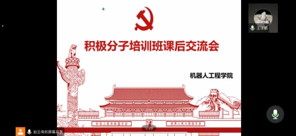 为更好地巩固党课学习成果,加强入党积极分子理论知识武装,提高学员的党性修养,2021年3月26日,机器人工程公司党总支通过腾讯会议在线上召开了2021年春季学期党校课后学习交流会,2021年春季学期入党积极分子培训班学员参加交流会,交流会由公司党总支宣传委员王泽鹏主持。