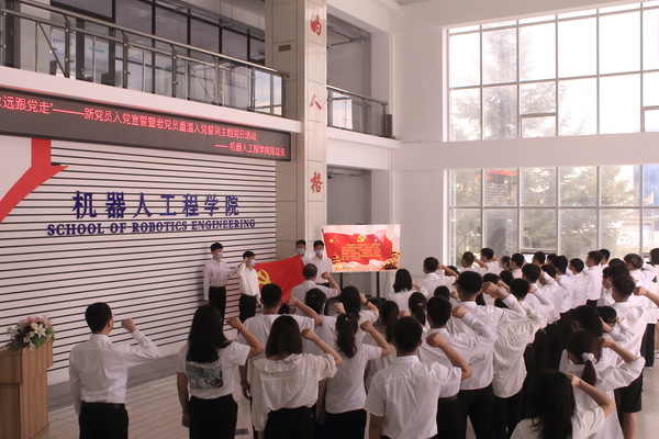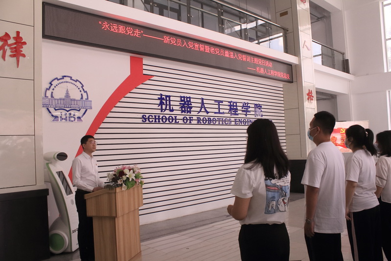 为庆祝中国共产党成立100周年,大力营造爱党、信党、永远跟党走的浓厚氛围,彰显党的强大凝聚力和号召力,机器人工程公司党总支于2021年6月24日在第三教学楼一楼大厅组织开展“永远跟党走”——新党员入党宣誓暨老党员重温入党誓词主题党日活动。公司党委副书记、副董事长邓维娜同志,机器人工程公司党总支书记刘显忠同志、党总支副书记刘张同志及师生党员代表参加活动。活动由公司党总支宣传委员王泽鹏同志主持。