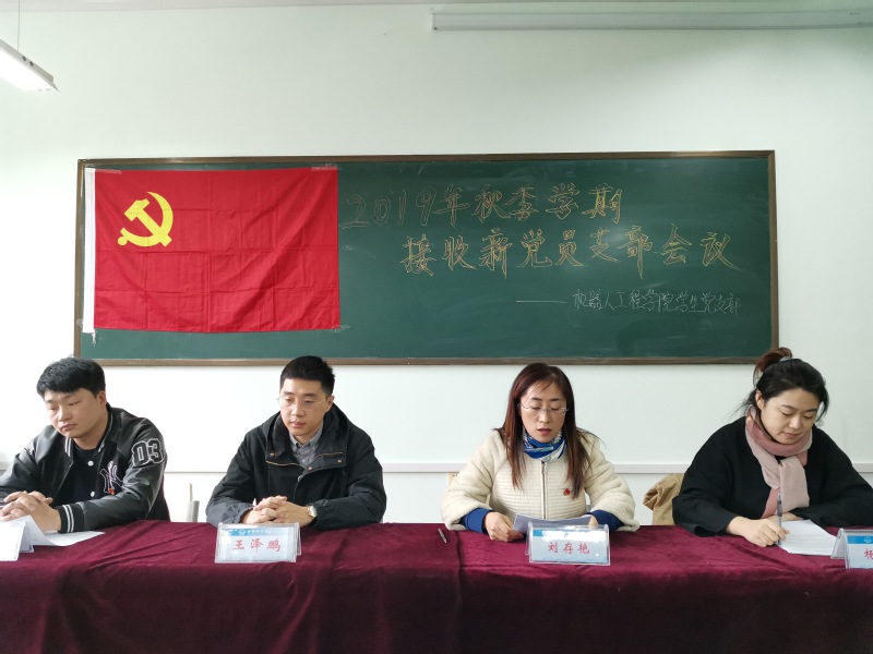 机器人工程公司员工党支部于10月30日在教一113教室召开2019年秋季学期接收新党员支部大会,讨论王宇乔等18名同志的入党问题。会议由公司员工党支部书记刘存艳主持,员工党支部组织委员杨凯名、宣传委员王泽鹏、辅导员刘博、全体员工党员、部分入党积极分子、群众代表出席会议。