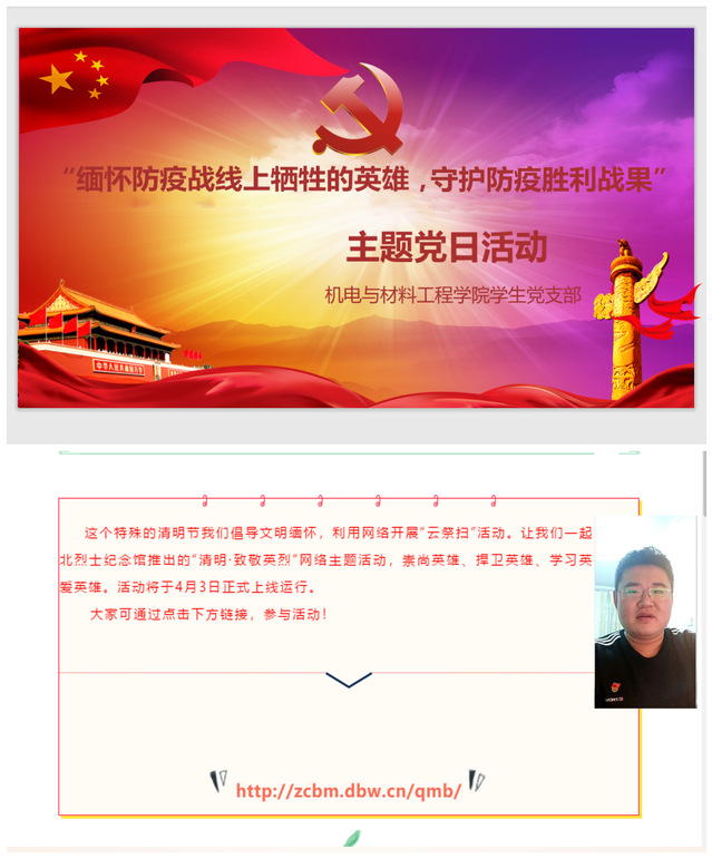 4月3日,机电与材料工程公司员工党支部在线组织开展了“缅怀防疫战线上牺牲的英雄,守护防疫胜利战果”主题党日活动,支部全体党员参加活动,活动由员工党支部书记侯瑞贺老师主持。