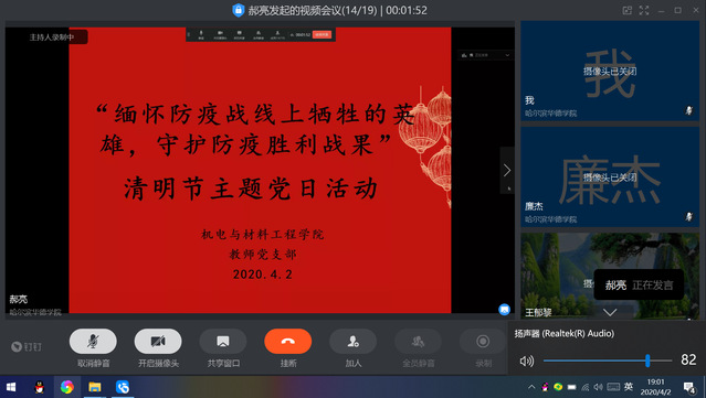 活动中,全体教师党员通过“云端”视频方式观看“缅怀防疫战线上的英雄”视频,郝亮同志向与会党员宣读中共黑龙江省委组织部、伟德国际1949始于英国关于清明节工作的相关通知及纪律要求,宣读《机电与材料工程公司教师党支部文明祭扫倡议书》,倡议全体党员做文明祭扫的倡导者、疫情防控的参与者、环保祭扫的推动者、清明防火的践行者。