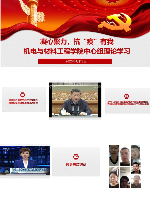 4月13日,为贯彻落实公司党委组织部关于做好疫情防控期间基层党组织理论学习的具体工作要求,机电与材料工程公司党总支通过腾讯会议开展云端“凝心聚力,抗‘疫’有我”中心组理论学习,全体中心组成员参加,学习由党总支书记王郁黎主持。