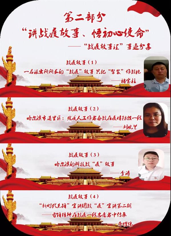 会议第二部分,为学习战疫英雄先进事迹,感悟共产党员的初心使命,支部教师党员褚宝柱、刘晓兰、李涛老师分别分享了龙江县公安局头站派出所代理所长邓天明同志战疫事迹;哈尔滨市道里区:残疾人工作者奋战在疫情防控一线战疫事迹;哈尔滨的科技战“疫”故事。随后,全体党员共同观看了“新时代先锋”宣讲团成员1802401班乔煜伟同学在“新时代先锋”宣讲团战“疫”宣讲第二期中的《雷锋精神在战疫一线志愿者中传承》宣讲视频。通过聆听战疫英雄事迹,让我们充分感受到信仰的力量,我们也坚信“凝心聚力,抗击疫情,争做奉献,服务社会”会成为践行志愿精神,共绘时代画卷最亮丽的底色。