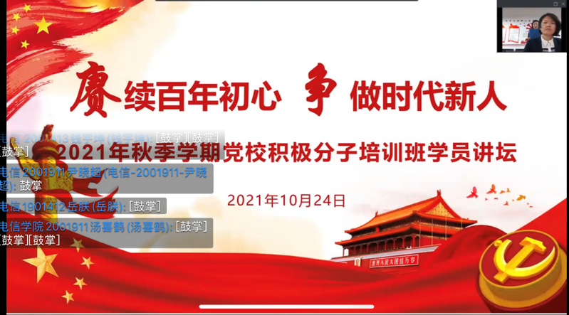 为增进学员间的学习交流,提升培训效果,10月24日,公司组织2021年秋季学期党校积极分子培训班学员开展以“赓续百年初心,争做时代新人”为主题的学员讲坛活动,班主任王国清老师及全体学员参加活动,各公司学员代表作了精彩的主题发言。