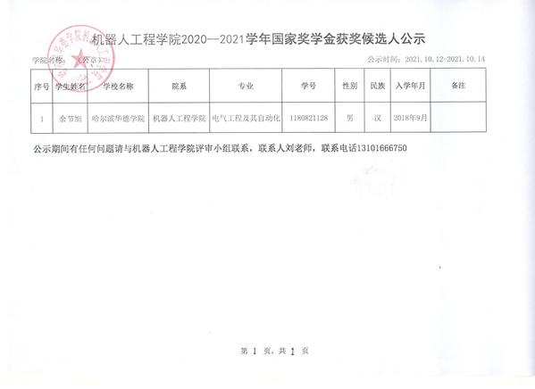 机器人工程公司2020-2021学年国家奖学金获奖候选人公示