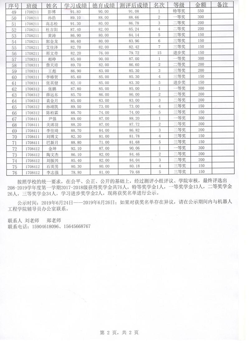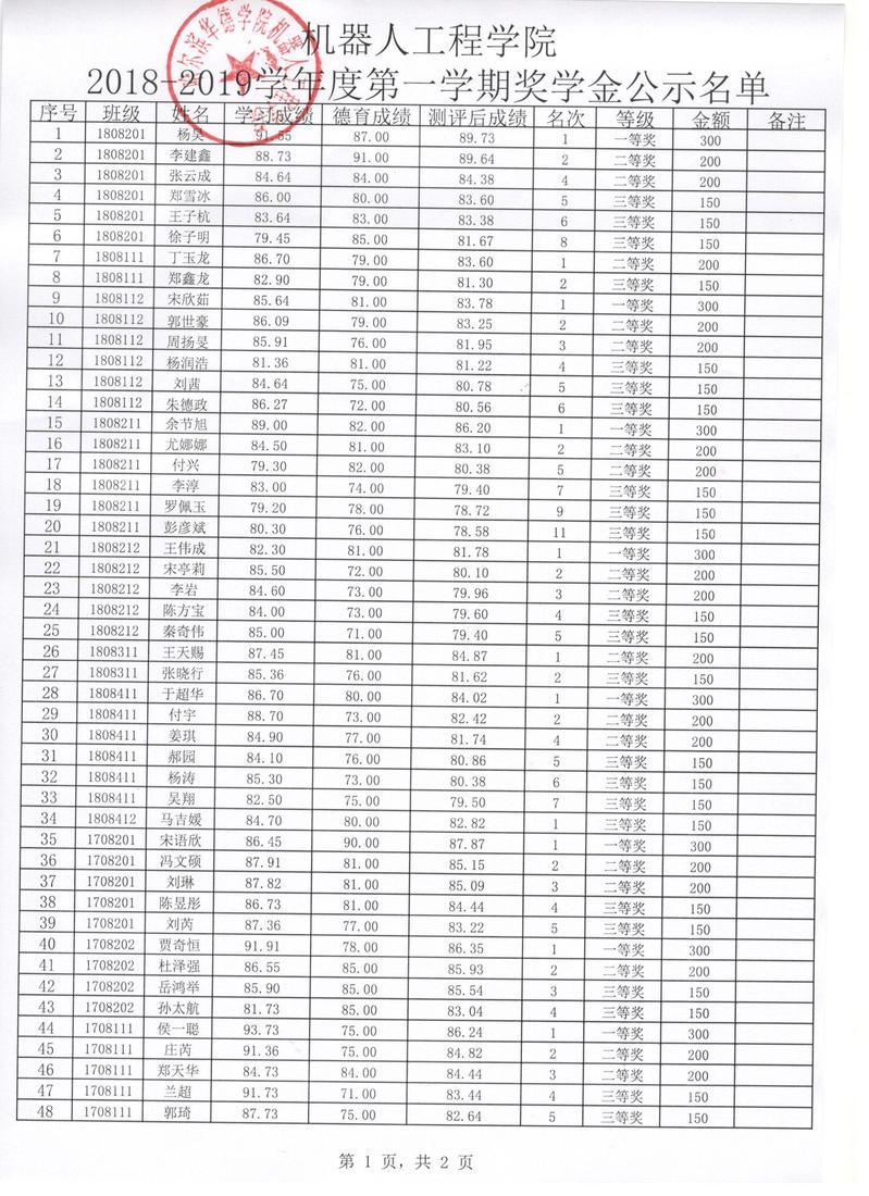 机器人工程公司2018-2019学年度第一学期奖学金公示名单