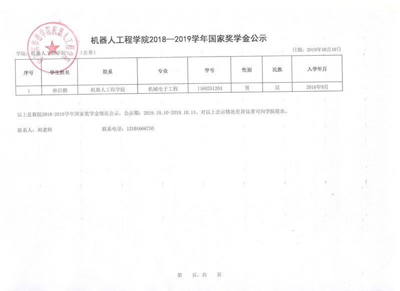 机器人工程公司2018-2019学年国家奖学金公示