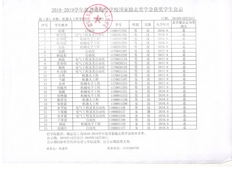 机器人工程公司2018-2019学年度普通高等公司国家励志奖学金获奖员工公示