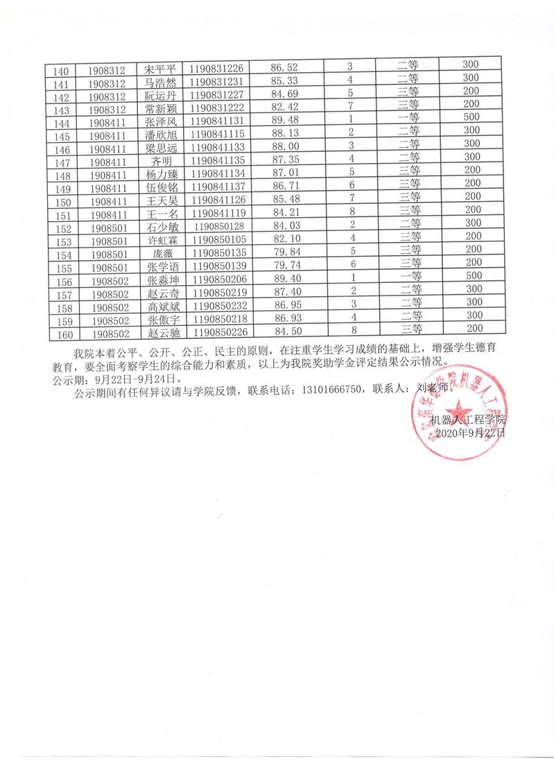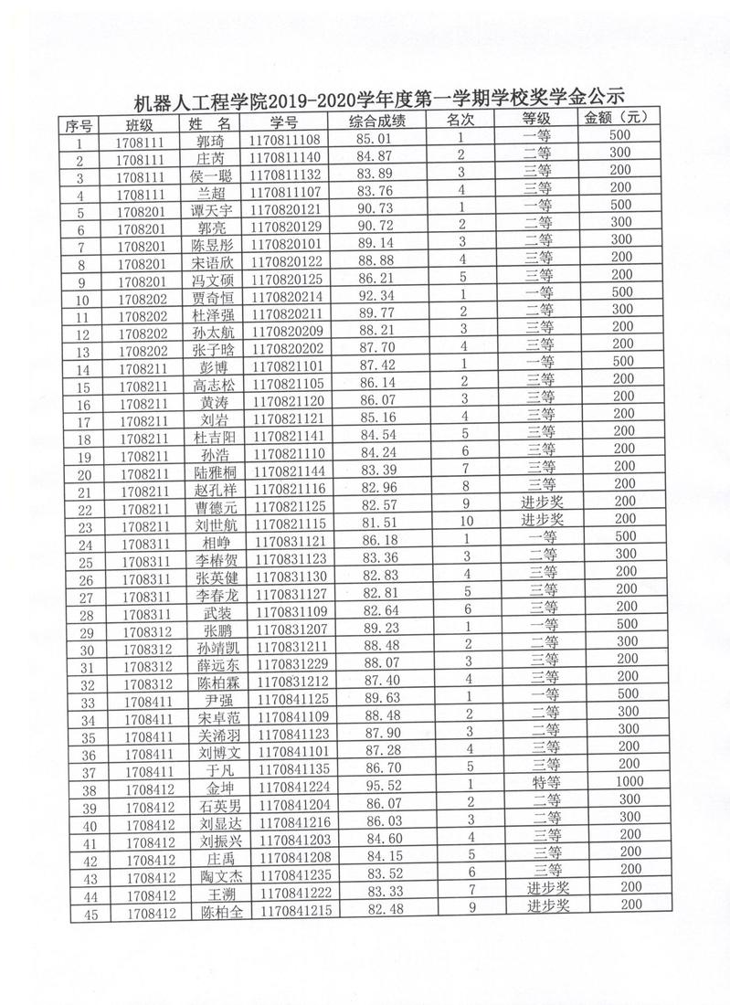 机器人工程公司2019-2020学年度第一学期公司奖助学金公示